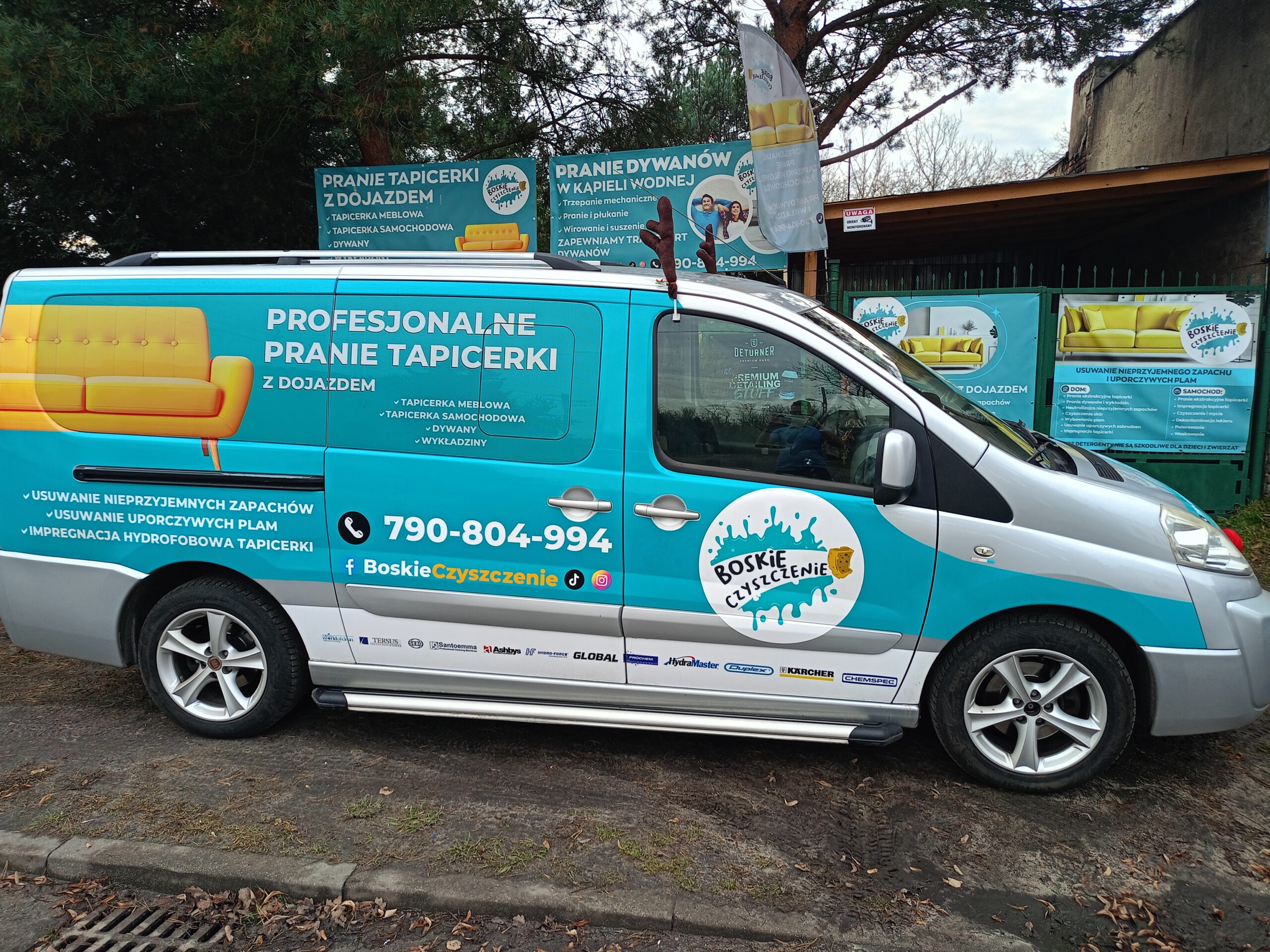 Dzięki profesjonalnemu oklejeniu zyskał rozpoznawalny wygląd, który od razu mówi, czym się zajmuję. Jeżdżę do moich klientów z pełnym wyposażeniem, gotowy na każde zlecenie – od prania tapicerki meblowej i samochodowej, po czyszczenie dywanów i wykładzin. Gdy widzisz ten samochód, wiesz, że nadchodzi czystość bez kompromisów!
